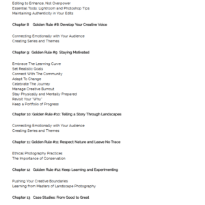 Unlock the Secrets of Breathtaking Landscapes is an inspiring and practical guide for photographers of all levels who aspire to elevate their landscape photography. This e-book unpacks the 12 golden rules that will transform how you approach capturing nature’s beauty, from mastering light and composition to telling compelling stories through your images.